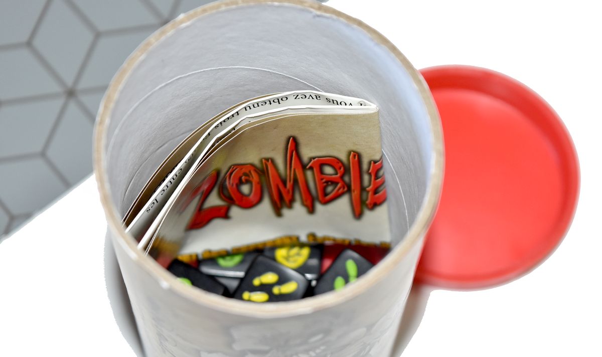 Côté matériel, c’est simple, efficace & suffisant pour ce style de jeu. Je pense que n’importe quel thème aurait pu fonctionner, mais là les zombies ça attrait toujours un peu quand même (dixit l’accro à Walking Dead 😉 ). Le gobelet est bien pensé puisqu’il est possible de le fermer et donc d’emmener tout le jeu avec soi en un rien de place !