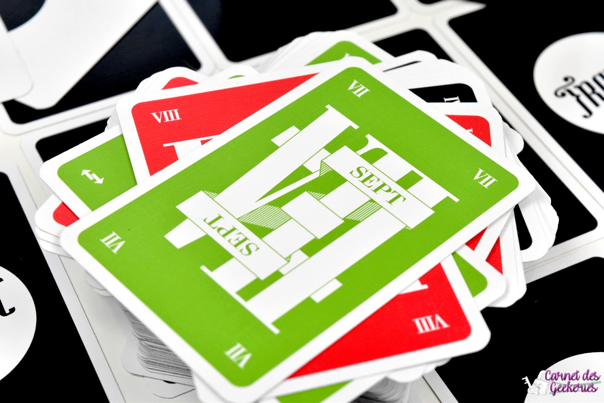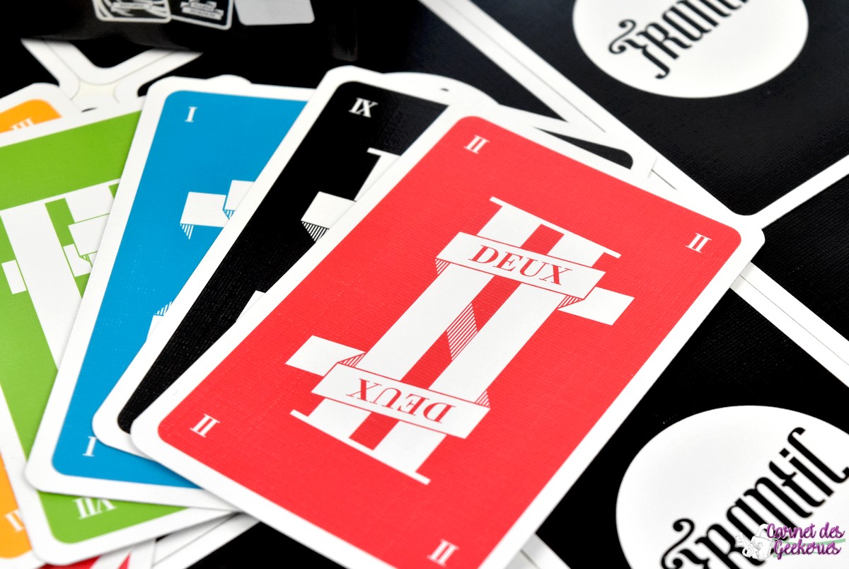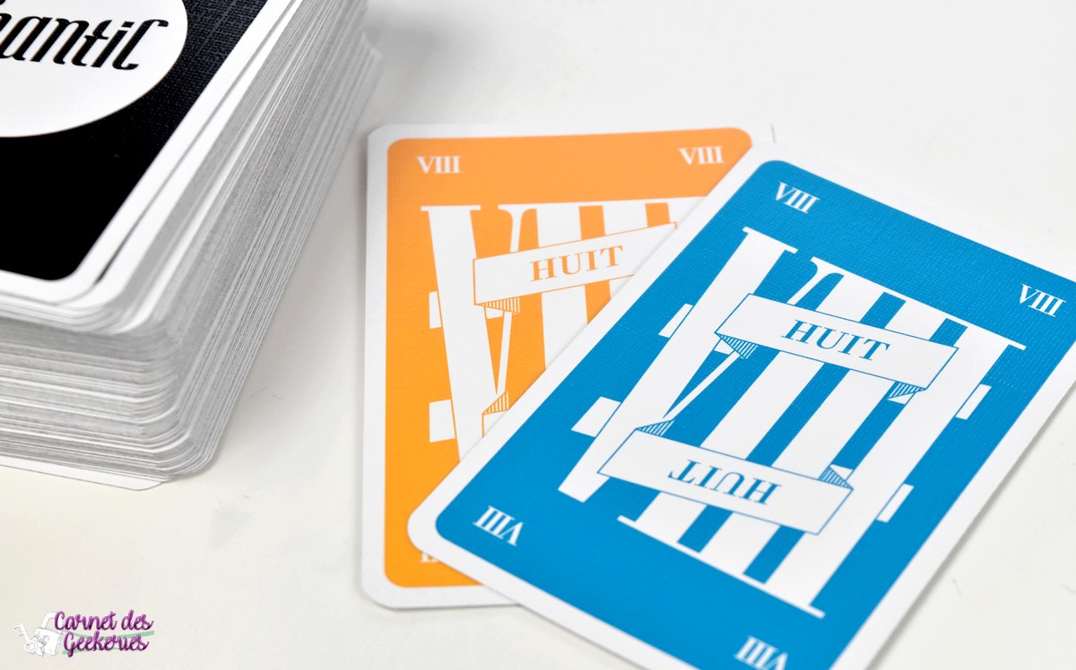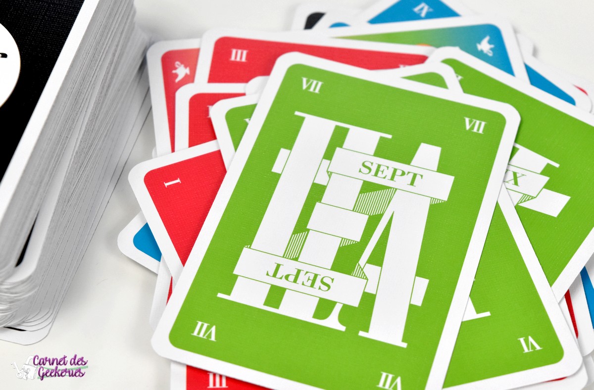 Alors pour les aficionados des « jeux moches » (il y a un « As d’Or » qui a ce titre de « jeu moche » pour moi…) aucune trace de marron mais des cartes multicolores dignes d’un très mauvais dégradé réalisé sur n’importe quel logiciel de retouche d’image. Mais ce n’est pas le pire, c’est le choix esthétique d’avoir des cartes numérotées de 1 à 9 en chiffre romain ! Je me demande si ce jeu n’a pas été créé en vrai par un complot « maçonnique des ophtalmologistes illuminatis » avec l’aide des « opticiens reptiliens platistes » ! Franchement, il n’y a rien qui ressemble plus à un VII qu’un VI ou un IV ! Cela fait mal aux yeux… Je suis sûr que c’est fait exprès pour filer prendre un rendez-vous après une partie !