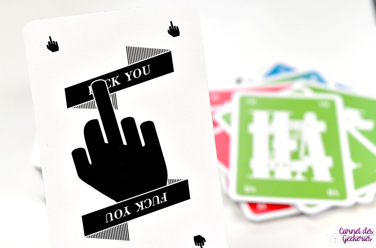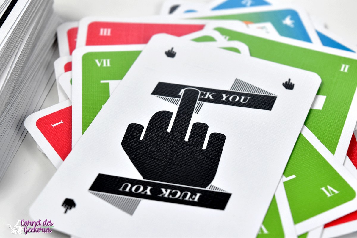 Pareil, petit conseil si vous faites découvrir le jeu, après un premier tour avec que les cartes de couleur, vous ajoutez les cartes noires pour un second tour d’initiation au jeu. Et vous en profitez pour insérer la carte « Fuck you » (je vous laisse lire la « super » règle pour savoir de quoi il en retourne) et d’expliquer le comptage de points de fin de partie. Car comme souvent dans les jeux de défausse, le but est de ne pas marquer de points et bien sûr les cartes que vous aurez encore en main lorsqu’un joueur aura vidé sa main, vous fera marquer des points, donc c’est pas cool !