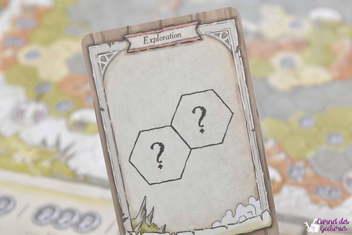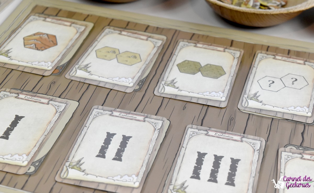 Tous les joueurs jouent avec une mappe personnelle mais tous ont la même (vous me suivez ?), et vont donc partir explorer les terres grâce aux 9 cartes explorations du jeu à travers 4 âges. Chaque âge se terminera dès que la pioche exploration sera finie. A chaque tour, l’un des joueurs va donc révéler une carte exploration qui indiquera la condition pour poser des cubes sur sa mappe.