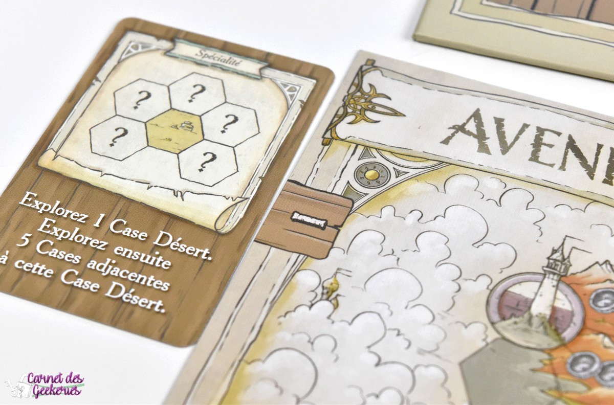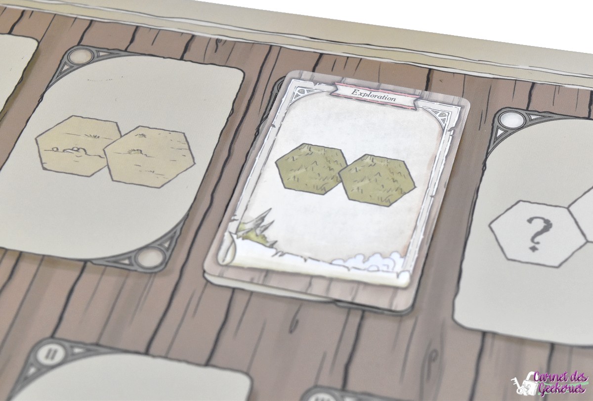 Pas de mauvaise surprise, on sait exactement les cartes qui vont sortir, et il y a juste l’ordre des cartes que nous n’aurons pas. Mais c’est assez pratique pour programmer un peu les actions qu’on souhaite réaliser, ou les coins de la mappe qu’on veut explorer. Et pas besoin non plus de retenir toutes les cartes sorties, puisqu’elles apparaissent bien sur le plateau.