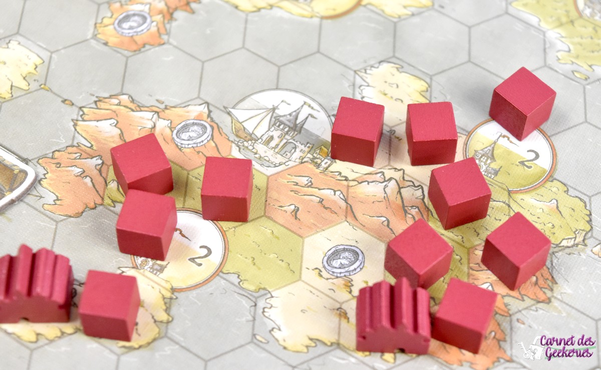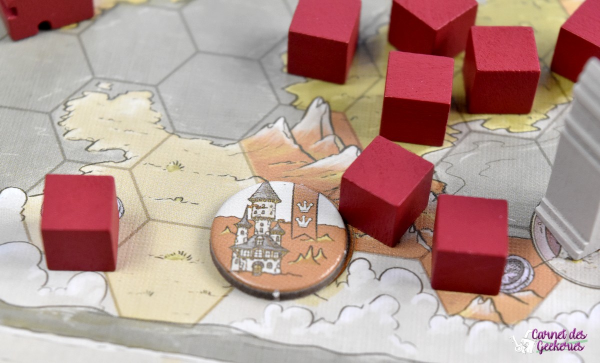 Mais en même temps, comme il faut cacher ses pièces jusqu’à la fin, ça permet d’éviter de deviner le score des autres. Oui, j’avais prévenu c’est pour chipoter. Comme le fait que les cubes peuvent facilement glisser sur la mappe lorsque vous les enlevez, mais en soi, rien de dérangeant du tout (on essaiera juste de ne pas avoir deux mains gauches pendant la partie) !