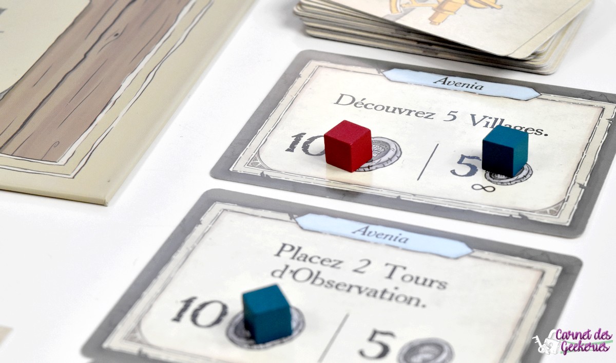 Les premiers cubes posés sur la mappe partiront forcément de votre capitale, mais petit à petit votre zone va s’élargir et vous permettre d’aller vers d’autres horizons. On révèle donc une première carte pour connaître la condition de ce premier tour. Ces conditions vont concerner un type de terrain ou une configuration à respecter pour vos cubes. Si la première carte révélée est celle avec 2 terrains forêt, tous les joueurs en même temps, iront poser deux cubes sur des forêts adjacentes à leur capitale. Par la suite, ils pourront poser des cubes adjacents à d’autres cubes déjà posés, ou à des villages déjà construits.