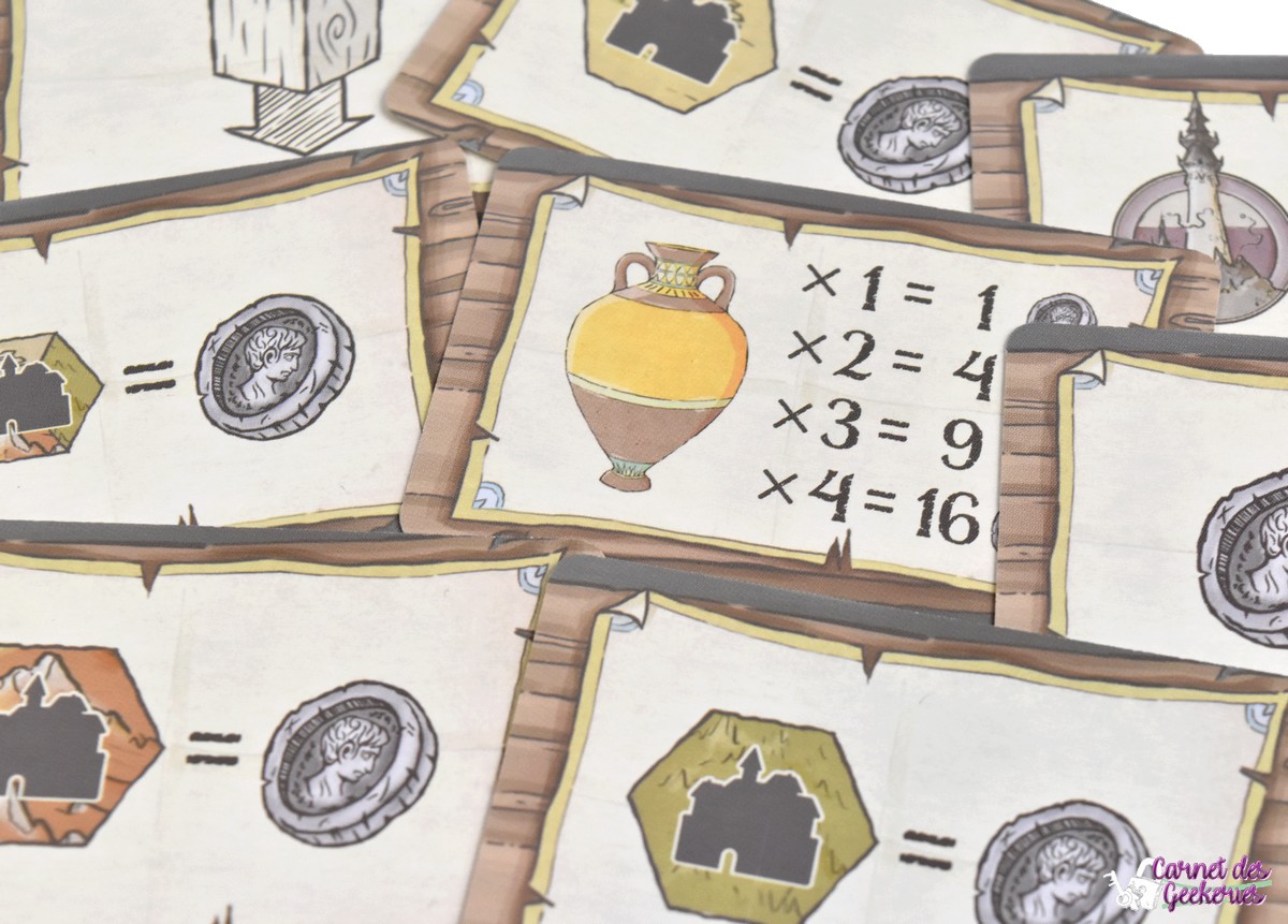 Petit à petit, on va donc poser de plus en plus de cubes sur notre mappe, et notre exploration va s’agrandir pour tenter d’aller récupérer des trésors et des tours d’observation. Les trésors seront cachés sous les ruines de votre plateau. Dès que vous réussissez à atteindre une ruine, vous placerez un jeton dessus pour dire qu’il a été exploré, et vous pourrez récupérer une carte trésor. Ces cartes vous permettent de poser immédiatement des cubes, de faire une collection de jarres, de récupérer des pièces en fin de partie… Certaines cases du plateau vous feront également prendre des pièces immédiatement.