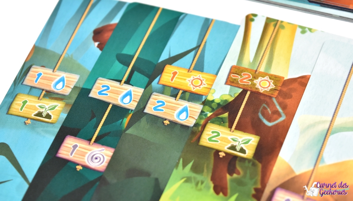 – Planter un arbre protecteur : en fonction des symboles pousse d’arbre, le joueur peut prendre un arbre protecteur de valeur égale ou inférieure. Il sera planté sur la forêt du joueur sur une case adjacente à un arbre déjà posé. Son effet sera activé instantanément et pour toute la partie. Si le joueur complète une rangée avec un bonus, il l’activera de façon permanente. Pareil si c’est construit dans un des coins de la forêt, le joueur reçoit le bonus de la case immédiatement.