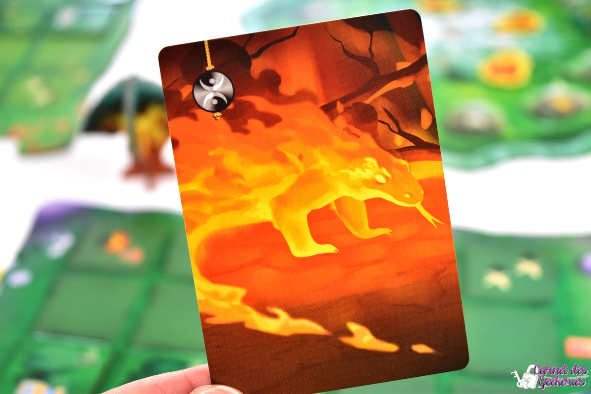 Il faudra tout de même surveiller le jeu des adversaires pour ne pas les laisser s’aventurer trop vers la victoire. On cherchera ainsi à leur prendre des jetons victoires pour les ralentir un peu, mais aussi à laisser le feu si nous on est capable de l’éteindre mais pas eux, histoire de pourrir un peu leur deck avec les cartes Varan.