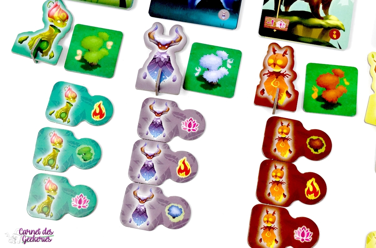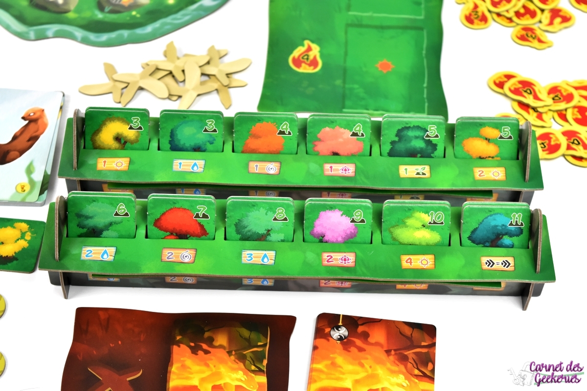 39 tuiles Arbre protecteur – 1 plateau central – 58 tuiles feu – 1 plateau Animal Gardien