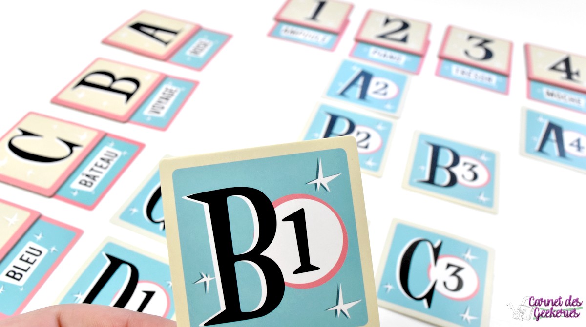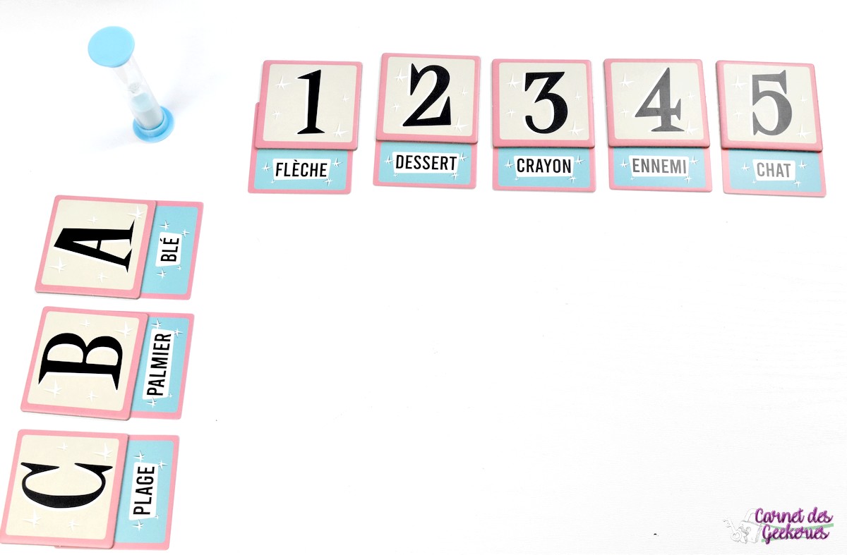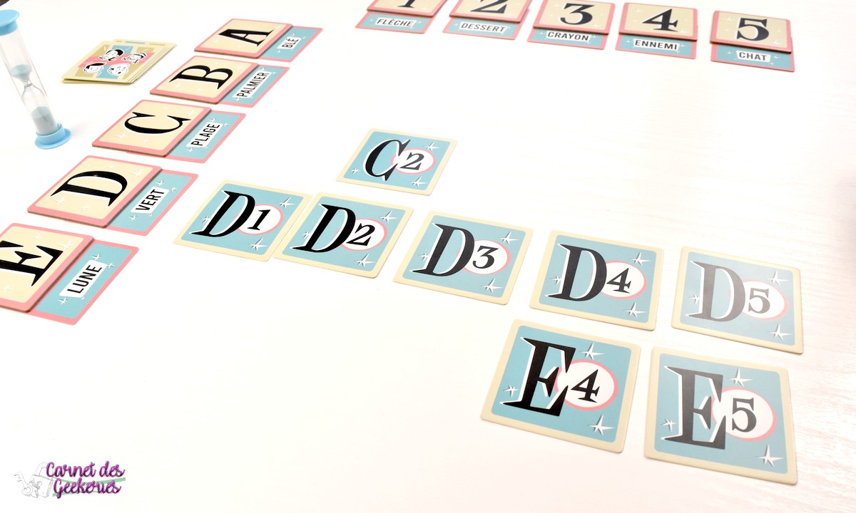 Pour la mise en place, on commencera par décider le niveau de difficulté qu’on souhaite (classique en 4×4, express en 3×3 ou expert en 5×5). En fonction de ça, on placera en grille les lettres et les chiffres correspondants. Et on récupèrera toutes les cartes coordonnées qui seront utilisées pour la partie. Les lettres seront placées en colonne et les chiffres en ligne. Les mots seront tous mélangés et on en placera un sous chaque chiffre et chaque lettre, avec un seul visible. Les coordonnées seront toutes mélangées et placées en pioche cachée. Le sablier sera posé au centre de la table et la partie va commencer !
