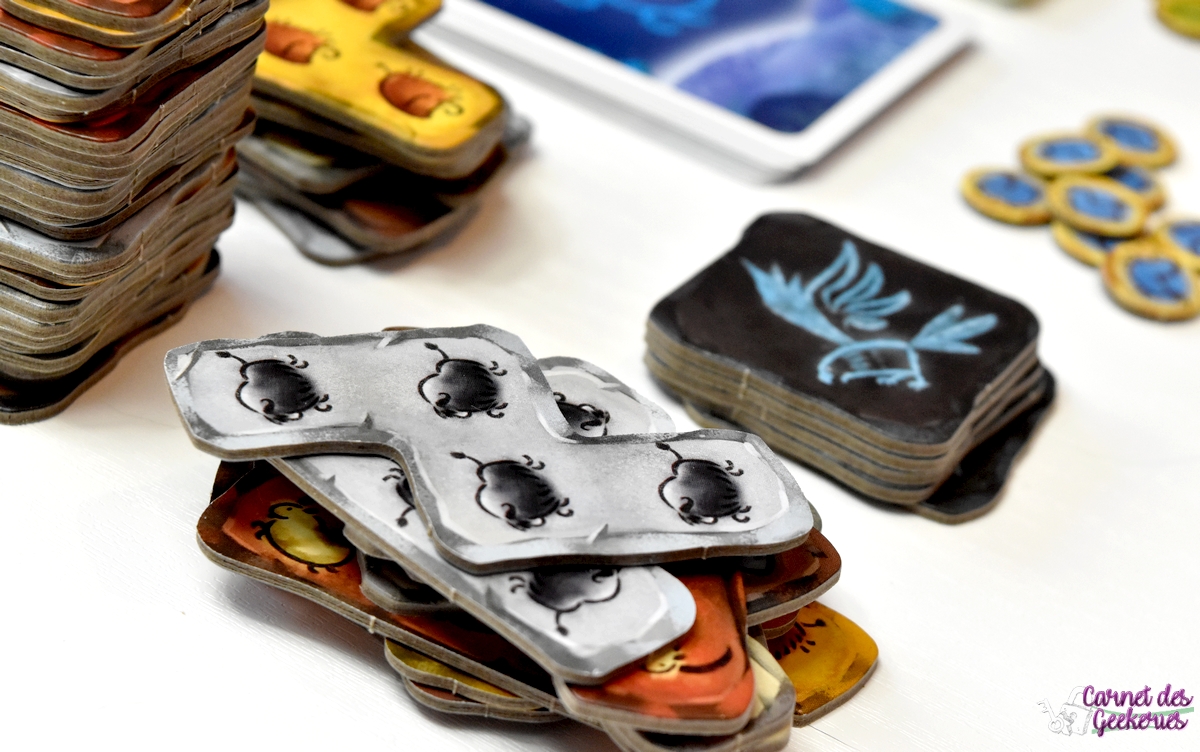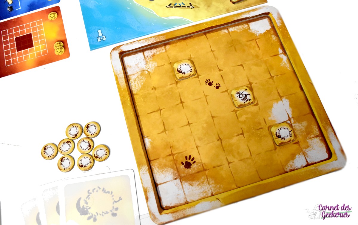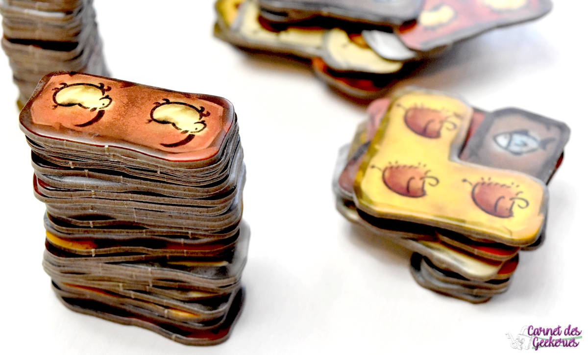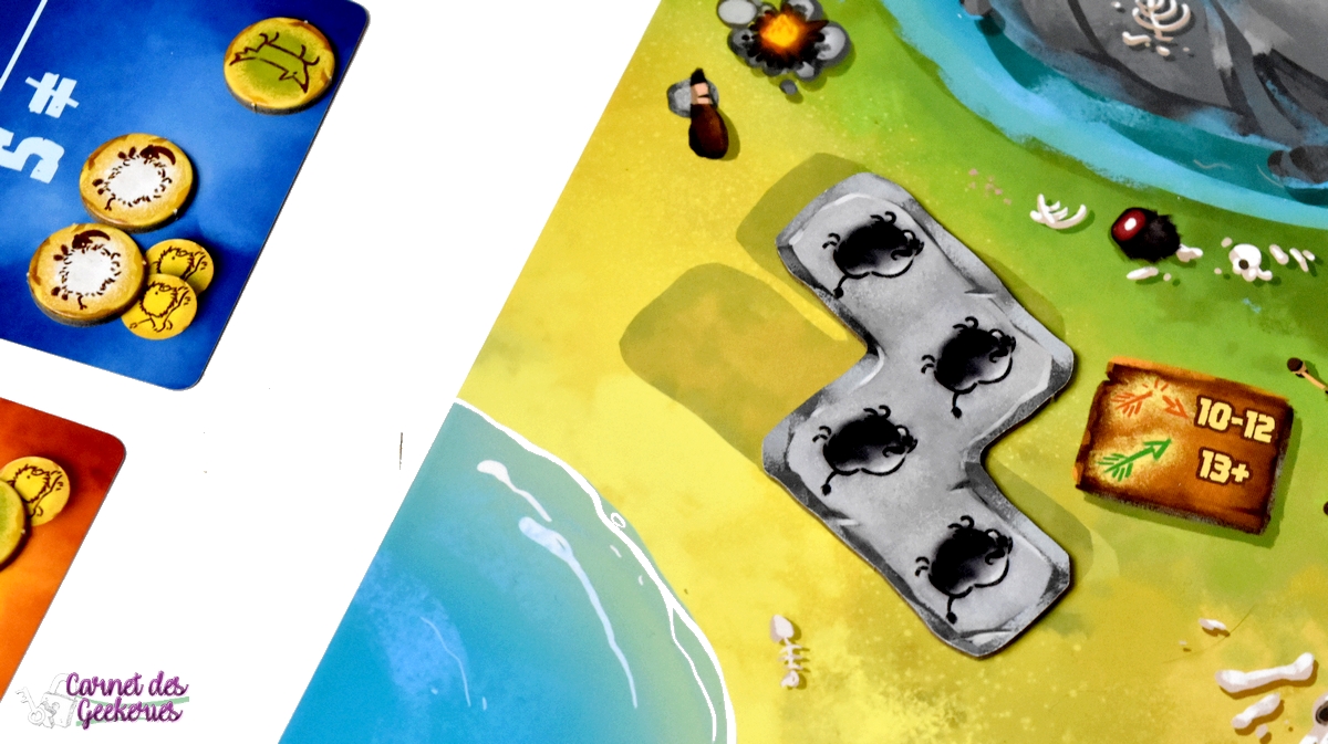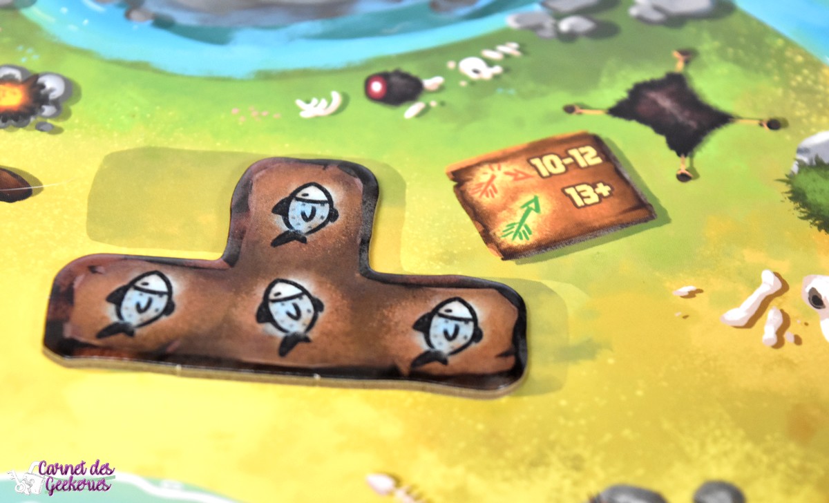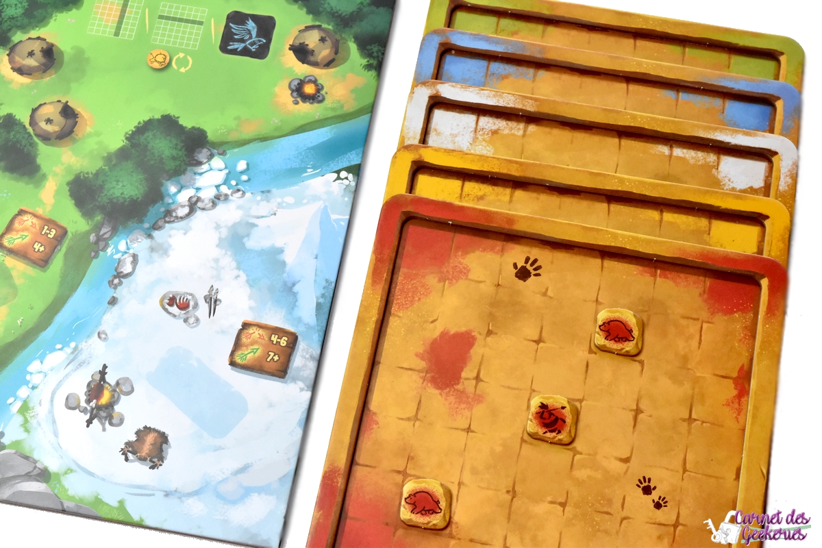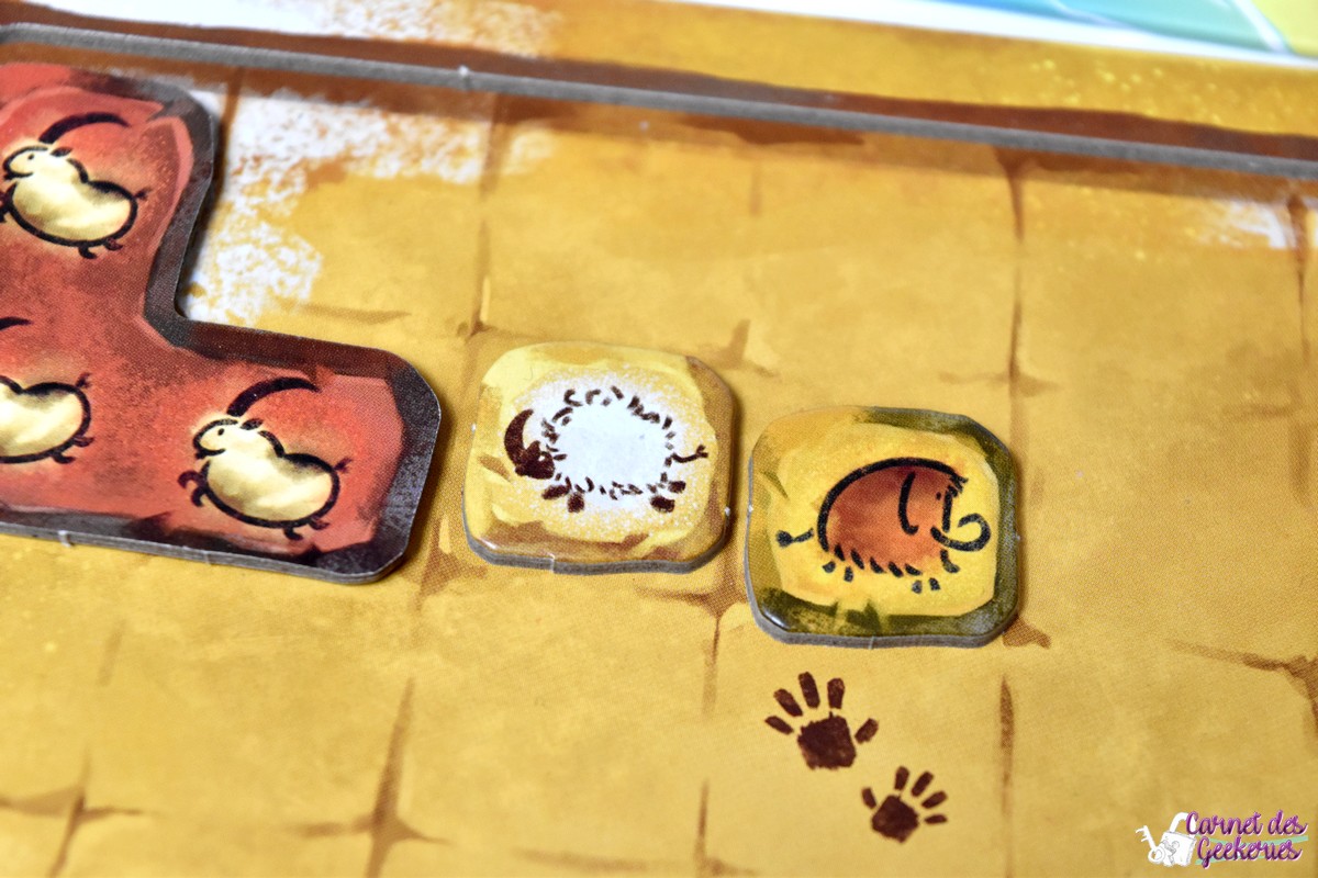 Forcément, avec Camille Chaussy aux pinceaux, le résultat magique est là ! Du matériel de qualité, des illustrations qui nous plongent dans l’ambiance avec un côté coloré qui donne tout de suite envie d’y jouer, et des tuiles pas droites qui rajoutent le petit côté original et préhistorique. Les plateaux en double épaisseur, le matériel solide en général, bref après pas mal de parties, il n’a toujours pas bougé. The Flying Games nous propose à chaque fois de belles éditions pour des prix totalement accessibles. Et ça se confirme encore ici !