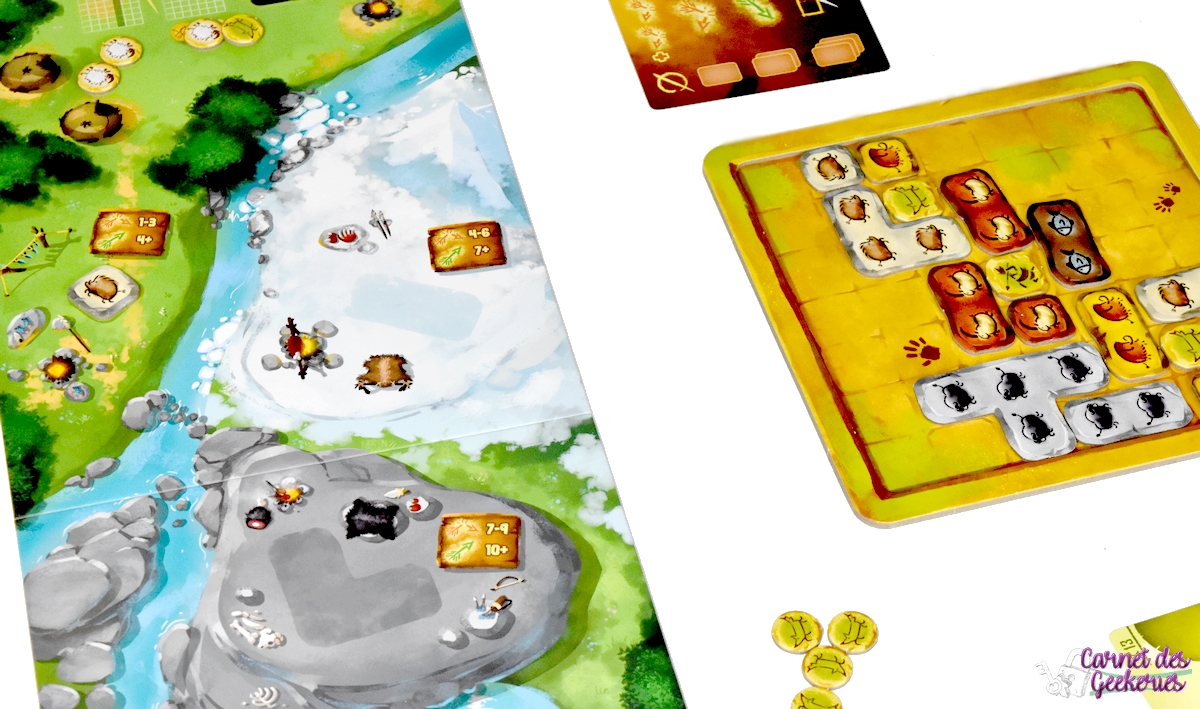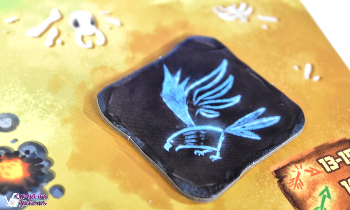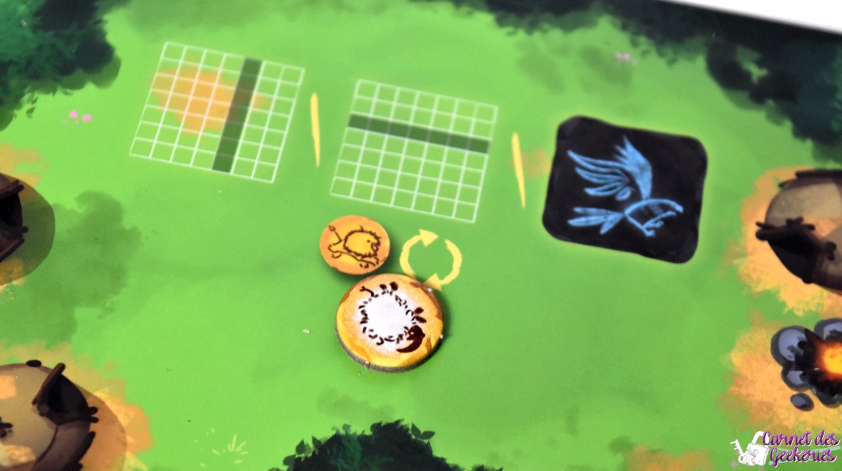 Au fur et à mesure, les joueurs vont remplir les conditions des objectifs, indispensables pour espérer l’emporter. Dès que c’est le cas, le joueur pose le nombre de jetons Totem indiqué sur l’objectif réalisé.