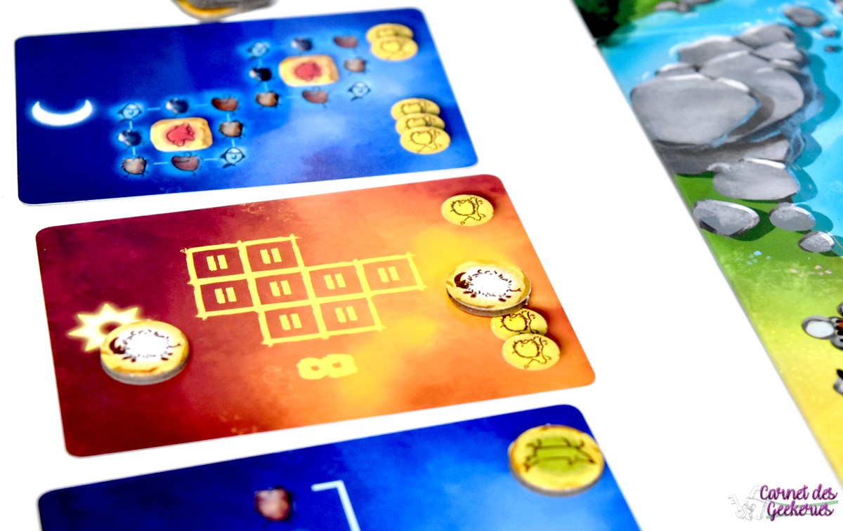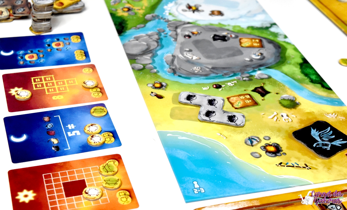 Le plateau est posé sur la table en fonction du nombre de joueurs. On mélange et on empile ensuite les tuiles animaux par taille. Et on en dépose une sur chaque emplacement prévu sur le plateau. Les cartes objectifs sont choisies au hasard, 4 pour des parties à 2 ou 3 joueurs et 5 pour des parties à 4 ou 5 joueurs. On peut ainsi varier les faces nuits et jours pour plus de rejouabilité et de challenge ! La partie peut alors commencer !