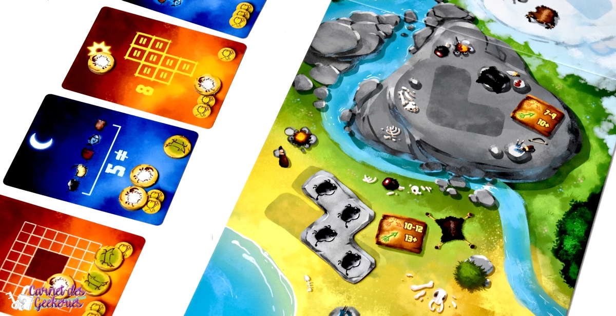 Comme à chaque jeu de chez The Flying Games je craque, mais là encore plus. On rentre dans un thème où on incarne des chasseurs préhistoriques à la recherche des meilleurs animaux pour la peinture de leurs grottes. Il va falloir ainsi faire les plus beaux exploits.
