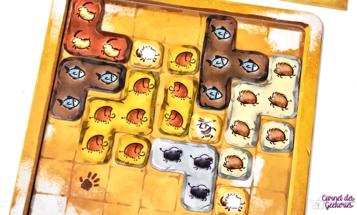 Dans Prehistories, il va donc falloir faire une véritable course aux totems pour l’emporter. Et pour s’en débarrasser, on aura les objectifs qui seront réalisés grâce aux polyminos. Mais on n’aura pas besoin de tout remplir hein, il faudra juste placer astucieusement ses pièces pour répondre aux objectifs. Et parfois on ragera de voir que la pièce qu’on veut n’est pas dans le bon sens, oui ça m’est arrivé plus d’une fois et j’assume totalement :p