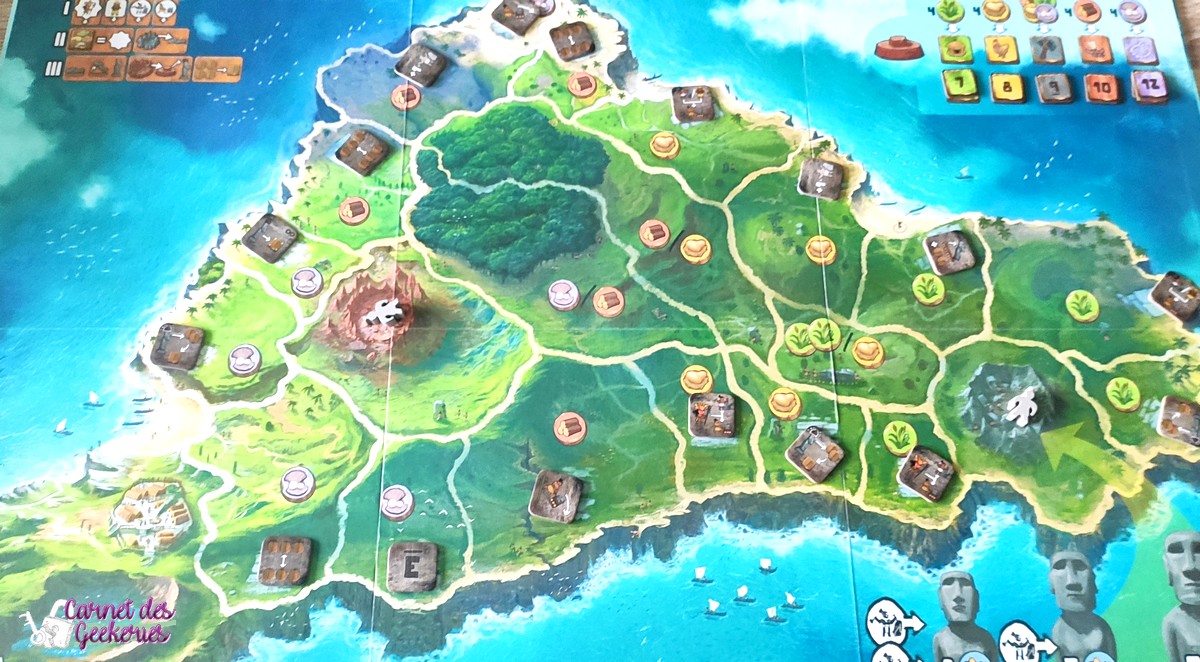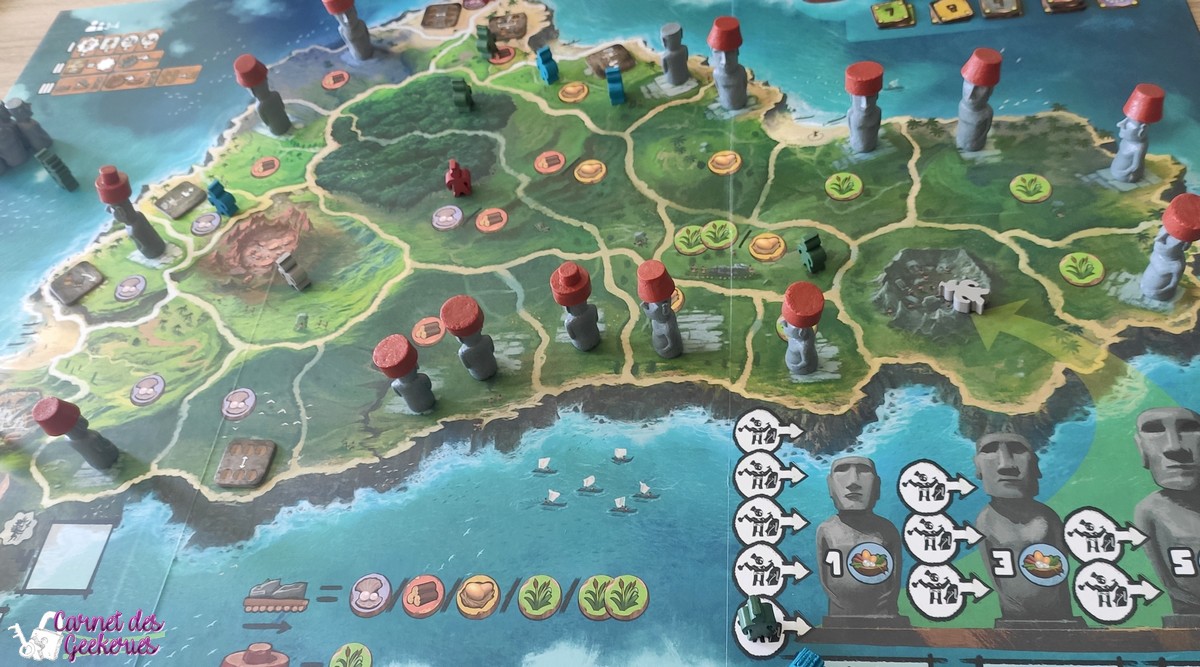 Une fois tous les ouvriers posés on va changer l’ordre du tour puis récupérer les statues que l’on a construites (petites ; moyennes ou grandes). La dernière étape est, en commençant par le premier joueur, de faire parvenir notre Moaï sur un Ahu où se trouve l’un de nos ouvriers. Pour ça on peut passer par des cases où se trouvent d’autres joueurs. Ils gagnent alors la ressource sur laquelle ils se trouvent. Arrivés sur la case finale qui nous intéresse, on récupère la tuile posée sur l’Ahu et on érige notre statue. Cela fatigue notre ouvrier que l’on allonge alors.