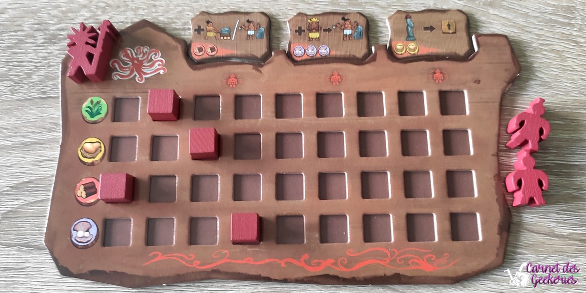 On gagne un certain nombre de ressources suivant la taille de notre statue et c’est au joueur suivant de jouer. L’autre action possible est de prendre un chapeau depuis la carrière et de le faire déplacer jusqu’à une case où se trouve un de nos ouvriers non fatigué et une statue sans couvre-chef. Une fois cela fait, on paie 4 ressources de notre choix pour faire une offrande et récupérer une tuile point de victoire.