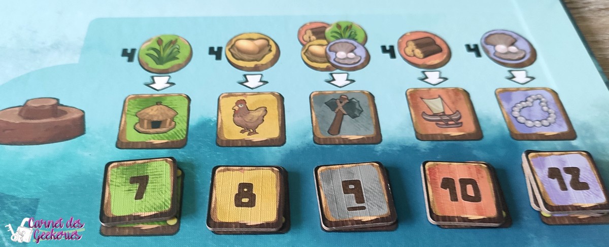 On peut également à tout moment de son tour, soit utiliser une tuile bonus récupérer, soit utiliser certaines ressources pour acheter une tuile amélioration. Il y en a 4 pour seulement 3 emplacements.
