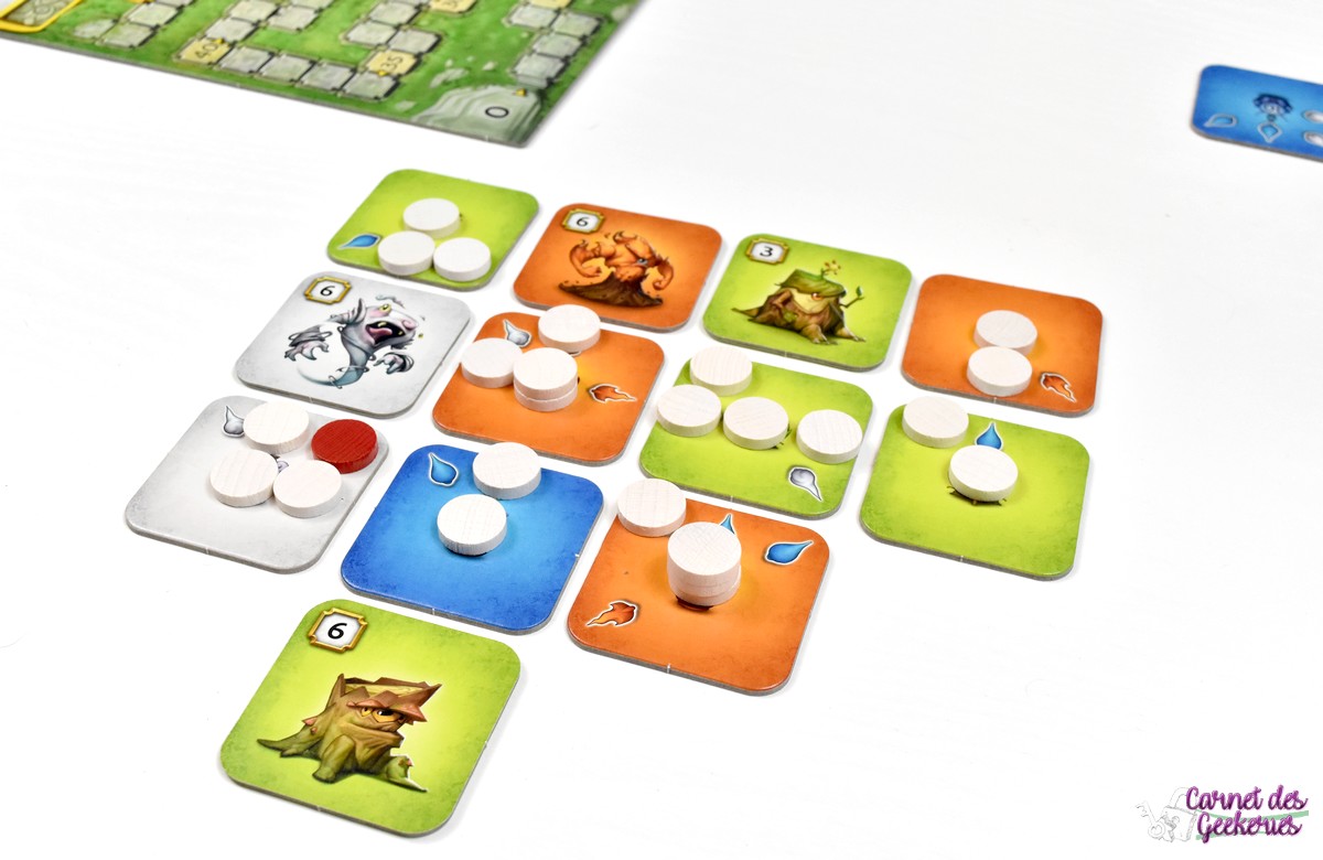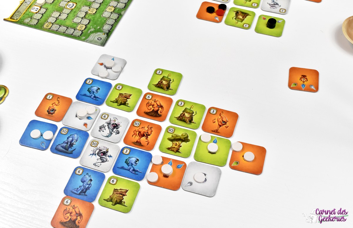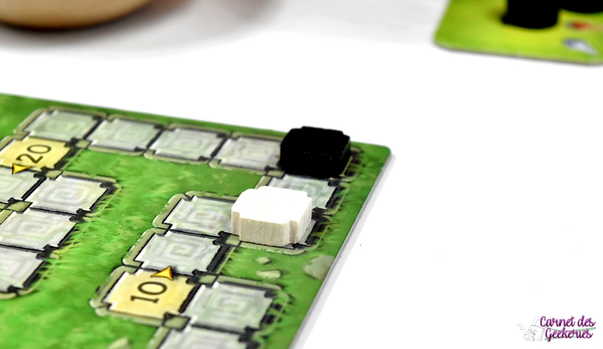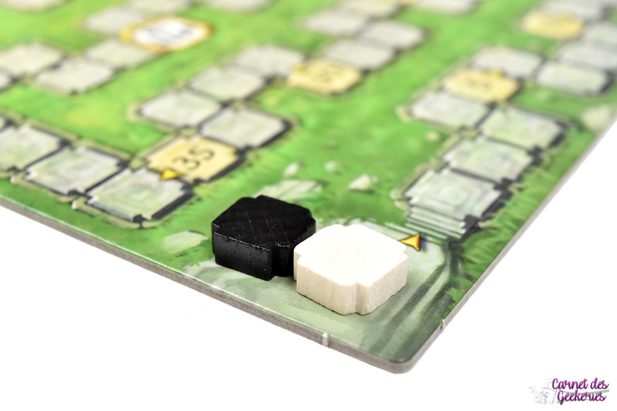 La durée de partie peut paraître un peu longue. Mais en étant sur ce genre de jeux casse tête et abstrait, on peut s’y attendre. La réflexion sera vraiment au centre du jeu. Même si l’explication de règles se fait en moins de 5 minutes, la partie sera bien plus longue. Mais ça ne m’a pas du tout dérangé. Au début, on score peu. Mais petit à petit les tuiles de 10 points commencent à se remplir et on avance bien plus vite sur la piste de score.