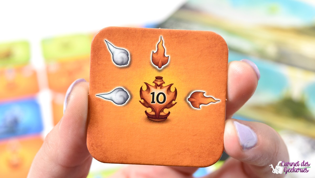 En effet, chaque score correspond à un nombre de flèches : 1 pour une tuile à 1 point, 2 pour une tuile à 3 points, 3 pour une tuile à 6 points et 4 pour une tuile à 10 points. Les interludes permettront aussi aux joueurs les plus en retard de se rattraper un peu. Ils choisiront en premier leur tuile s’ils veulent en prendre. Et ça, c’est pas négligeable mine de rien !