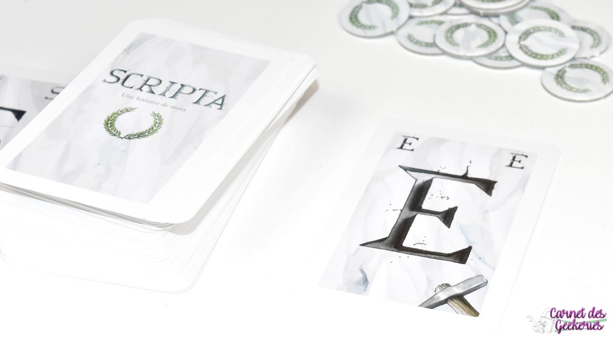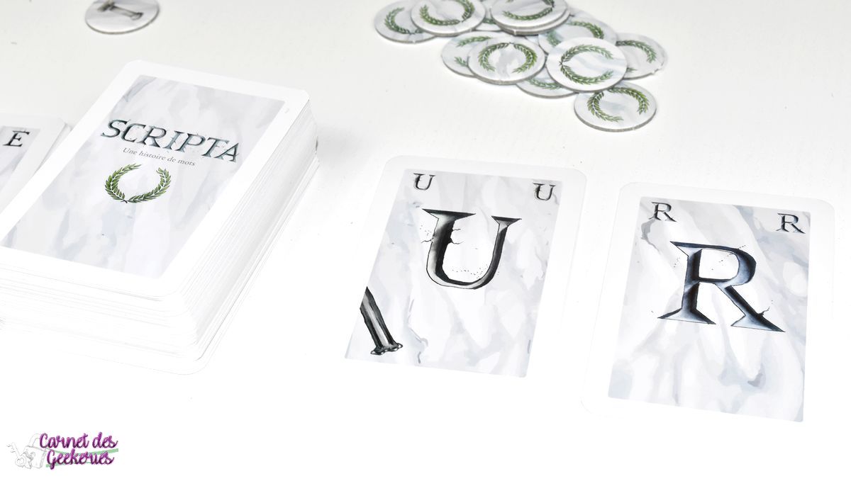 La partie se termine dès qu’un joueur n’a plus de cartes. Effet immédiat si le mot est validé 😉 On compte alors les points, avec 2 points par jeton Scripta et -1 pour chaque carte restant en main. Celui qui a le plus grand score l’emportera !