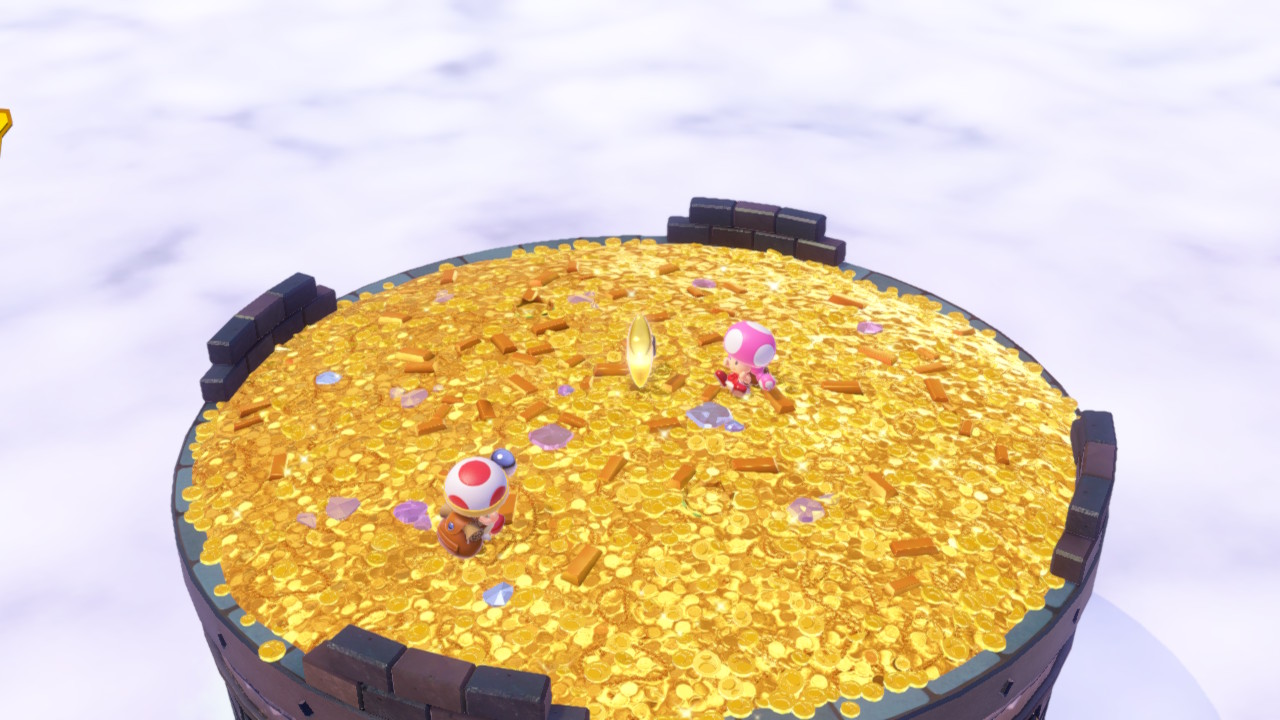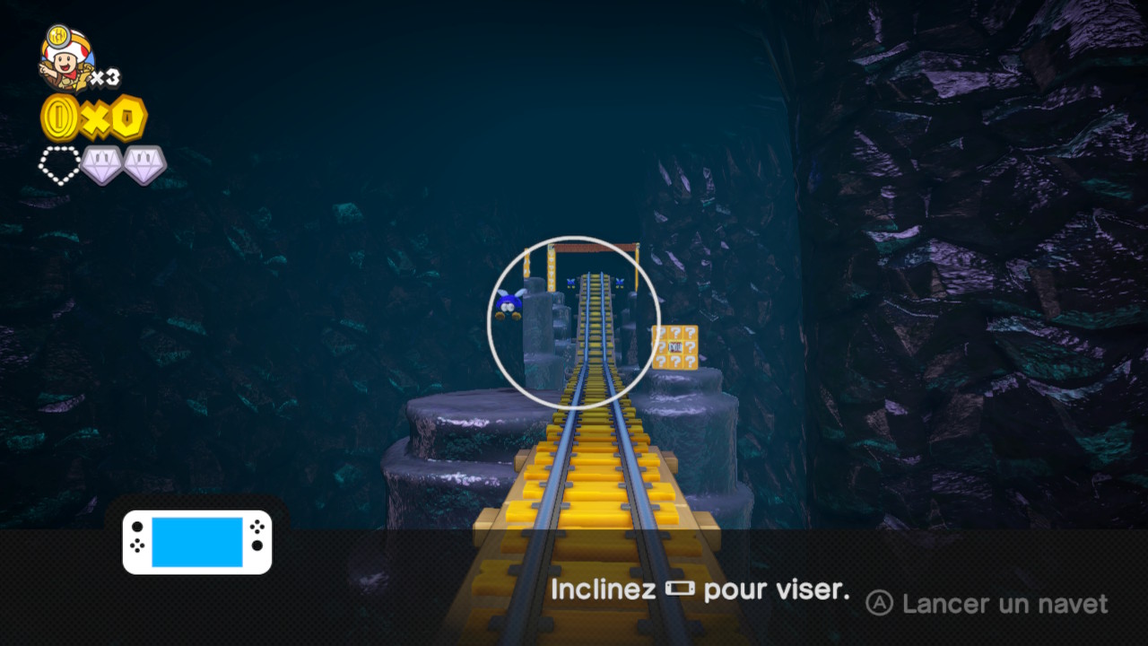 Captain Toad : Treasure Tracker, propose de jouer au maximum à deux joueurs sur la console, chacun avec son Joycon. Le premier dirige Toad, et le second joueur peut traquer toutes les pièces et objets cachés, en les révélant avec un pointeur. Il peut même et surtout, envoyer des navets sur les ennemis pour laisser le champ libre à Toad et lui permettre d’avancer plus facilement 😉