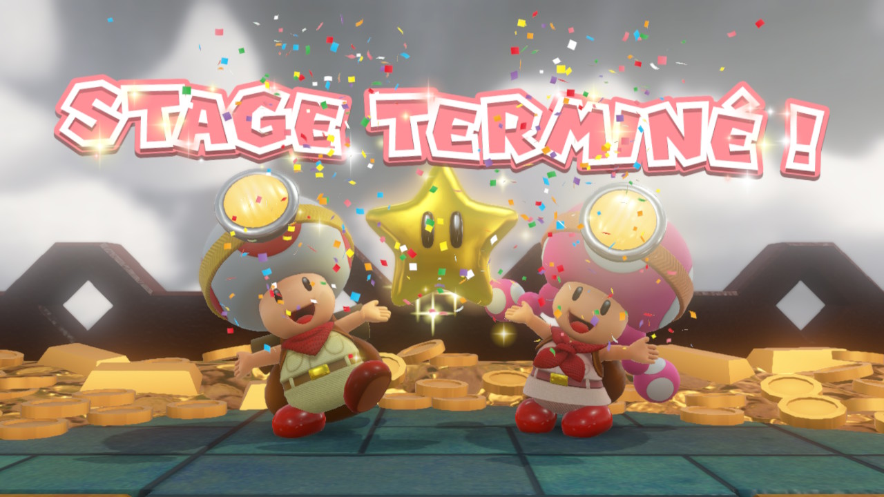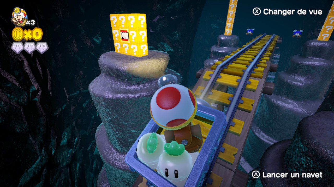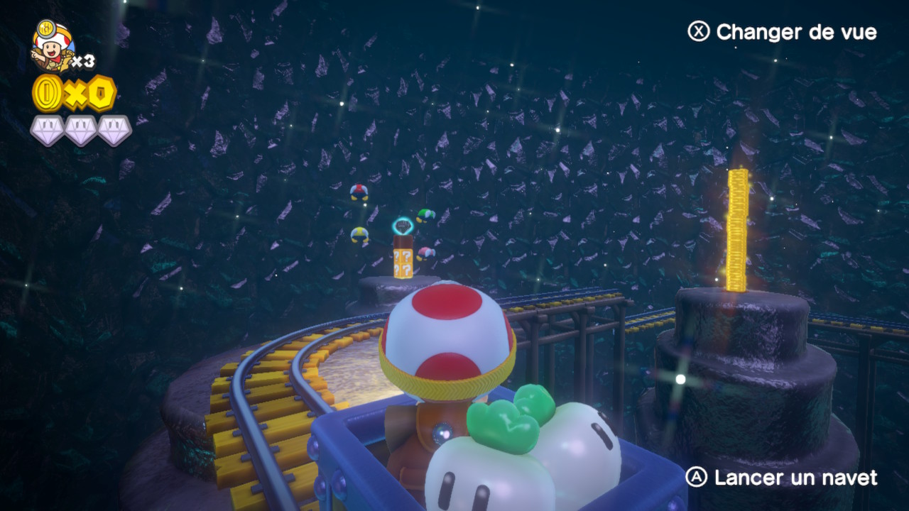 Dans ces niveaux, vous allez pouvoir tout d’abord faire la quête principale, c’est à dire ramasser trois diamants et récupérer l’étoile sans mourir. Vous aurez deux chances seulement si vous vous faîtes toucher (Toad devient légèrement plus petit comme dans Mario Bros !). Vous aurez ensuite la possibilité, une fois l’étoile récupérée, de faire le petit défi ! (les défis consistent par exemple à trouver un champignon doré, ou ramasser un certain nombre de pièces, ou encore éliminer tous les ennemis …)