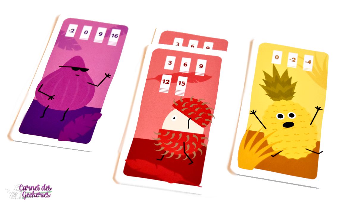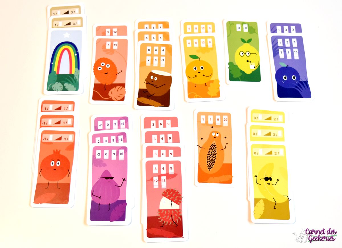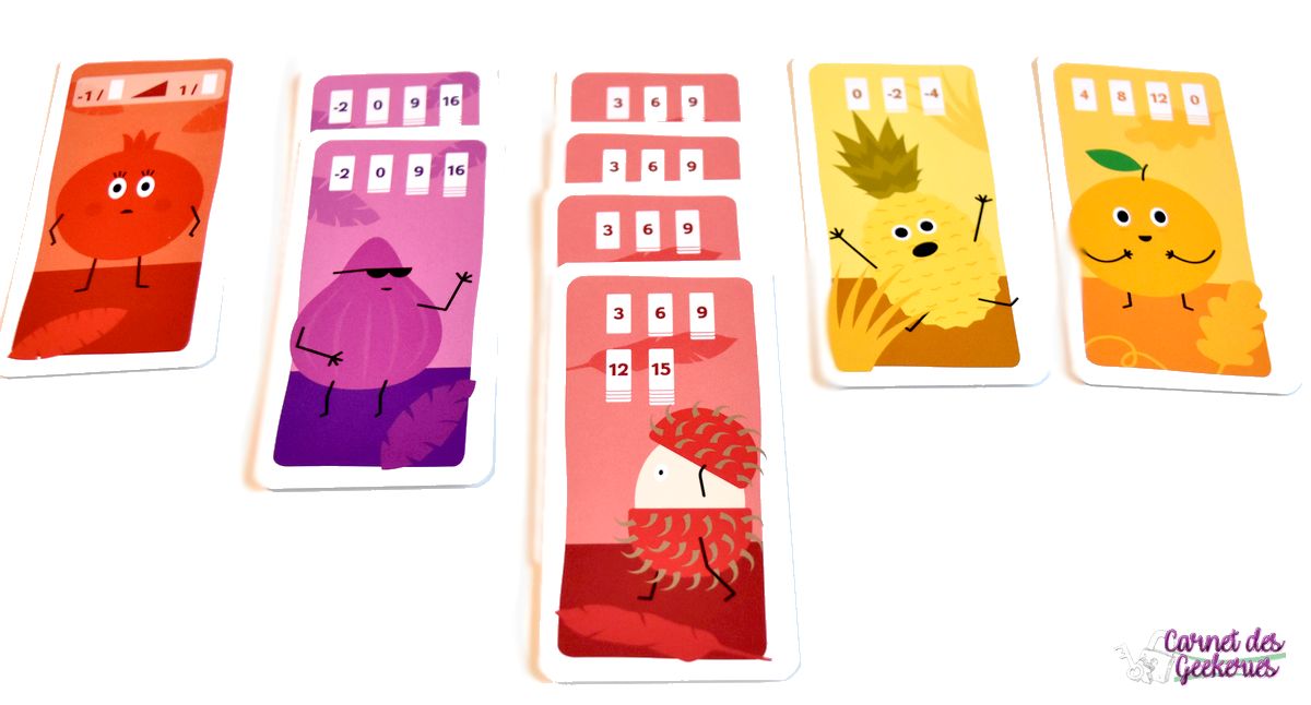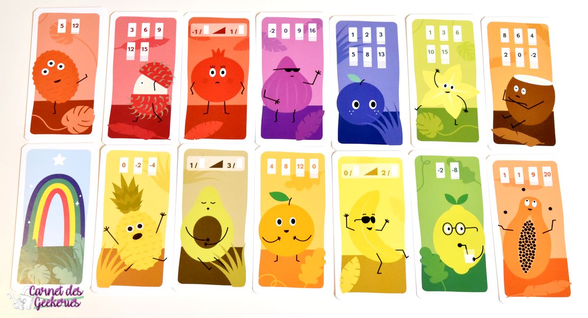 Rien de bien compliqué non ? Les fruits vous feront gagner ou perdre des points en fonction du type de fruits, du nombre de cartes que vous aurez et de leur façon de scorer. Certaines scoreront en fonction du nombre de cartes récupérées, et d’autres fonctionneront différemment. Pour les bananes, l’avocat ou la grenade, vous gagnerez des points par carte en fonction de celui qui a le plus de cartes. Ces cartes pourront vous faire perdre des points si vous n’avez pas la majorité de ce type de fruits. Il existe une seule carte joker qui permet de remplacer une carte (mais qui ne peut pas être ajouté à un type de fruits si vous avez déjà toutes les cartes de ce type).