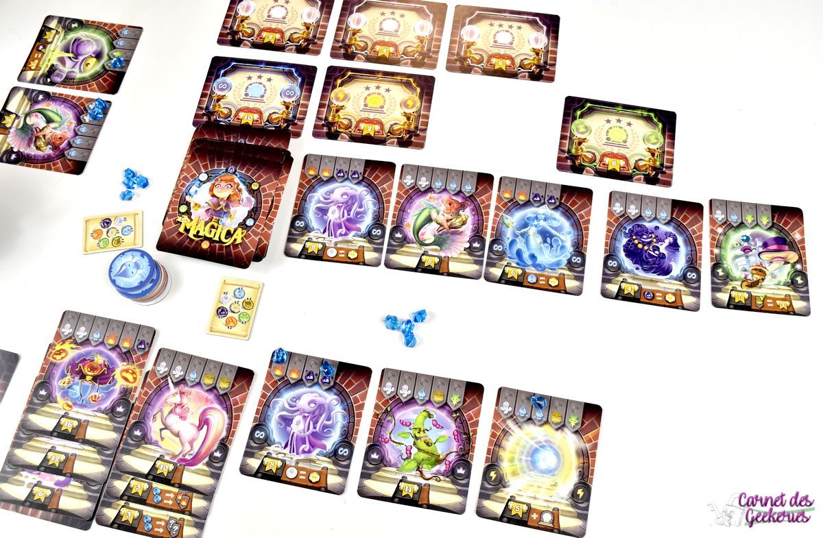 Pour la mise en place, les jetons Animus sont placés dans le sac. On formera deux lignes avec les 10 cartes récompenses au centre de la table. Tous les portails magiques sont mélangés et on en révèle 5 face visible. Chaque joueur prend 7 cristaux, un aide mémoire et pioche 6 portails. Parmi ceux là, il en gardera 3 qu’il posera visibles devant lui. Les autres seront défaussés. A savoir que devant soi, un joueur doit avoir assez de place pour créer sa zone de cristallisation et sa zone de réussite. Le joueur le plus âgé récupère le sac et la partie peut commencer.