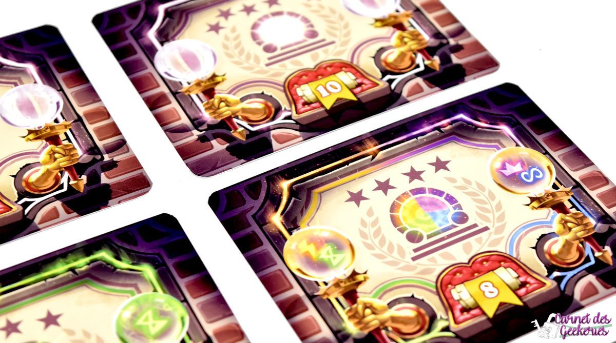 Les récompenses de couleur sont attribuées dès qu’un joueur ouvre 3 portails de la même couleur ou 4 portails de couleurs différentes. Pour celles de quantité, le joueur ne peut en réclamer qu’une seule pendant toute la partie. Il peut le réclamer lorsqu’il ouvre le nombre exact de portails nécessaires. Mais attention, du moment que le joueur en choisit un, il ne pourra plus le modifier. Il y a donc un risque de chercher à avoir une carte récompense qui rapporte plus de points, mais qu’on peut se faire piquer avant d’y arriver.
